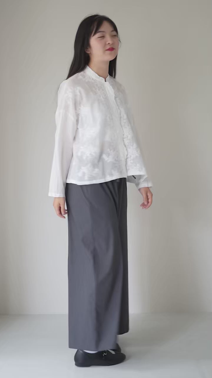 ややゆとりを持たせたワイドシルエット。滑らかなドレープ感のある生地によってカジュアルになりすぎず、洗練された印象を与えてくれます。