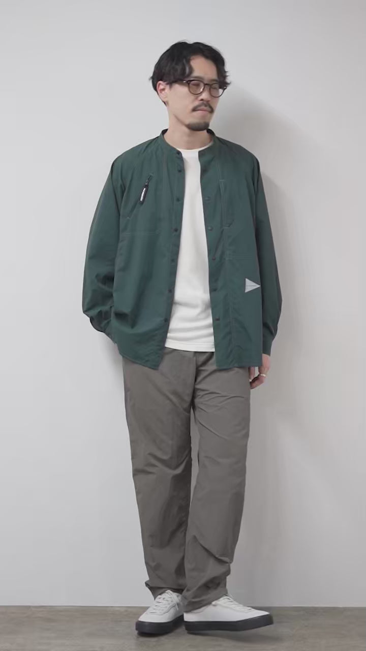 軽さ・撥水性・UVカットを兼ね備えたリサイクルナイロン素材で仕立てた、and wanderのバンドカラーシャツ。