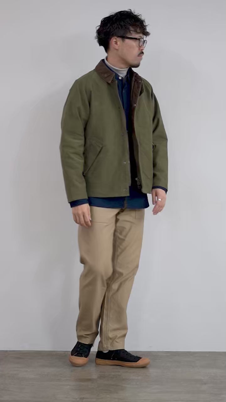 ボトムとのバランスも取りやすく、重厚感のあるモールスキンでも軽快な印象に見せてくれる一着です。