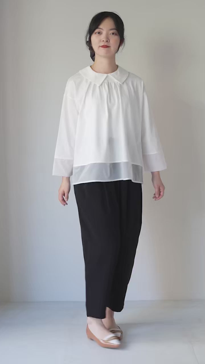 袖と裾にあしらったソフトチュールの繊細な透け感が、洗練された雰囲気を演出。首元のギャザーがシンプルなデザインに陰影を生み、奥行きのある表情をプラスします。