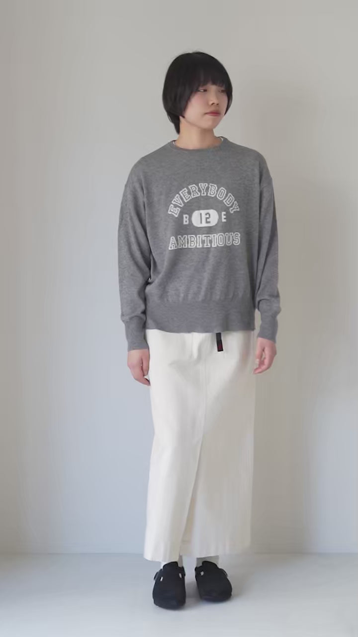 フロントにあしらわれたカレッジロゴは、「みんな大志を抱け!」という前向きなメッセージを込めたMAO MADEオリジナル。学生っぽくなりがちなロゴも、ハイゲージニットの上品な質感と掛け合わせることで、大人の女性に似合う”ちょうどいい可愛さ”へと昇華しています。
