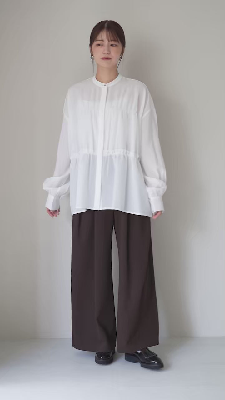 普通のシャツブラウスに「少し柔らかなニュアンスがほしいな」と感じる時に丁度良いデザインは、日常使いはもちろん、オケージョンシーンにもマッチ。シワになりにくく、ご自宅でケア可能なため、扱いやすさも兼ね備えた一枚です。