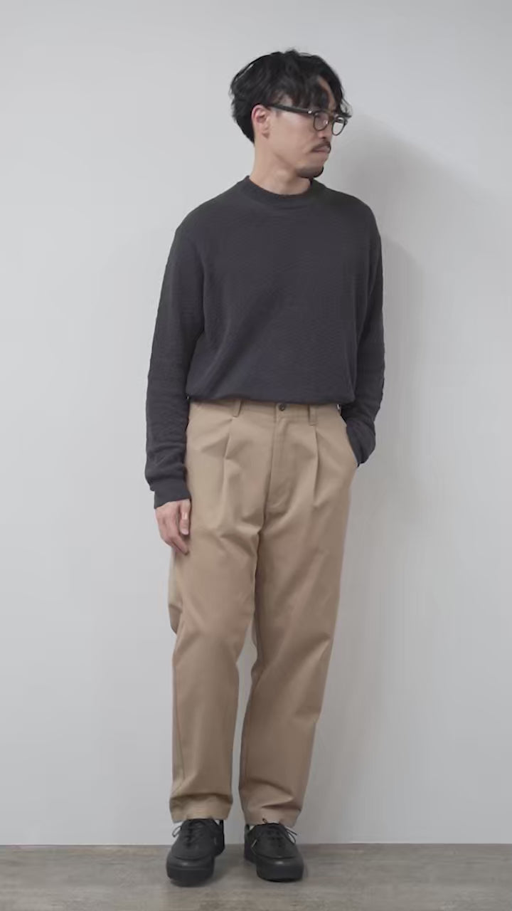 本モデルは、フロントにワンタックを落とし込んだアイテム。チノパンとスラックスの中間にある「さりげない上品さ」が特徴です。