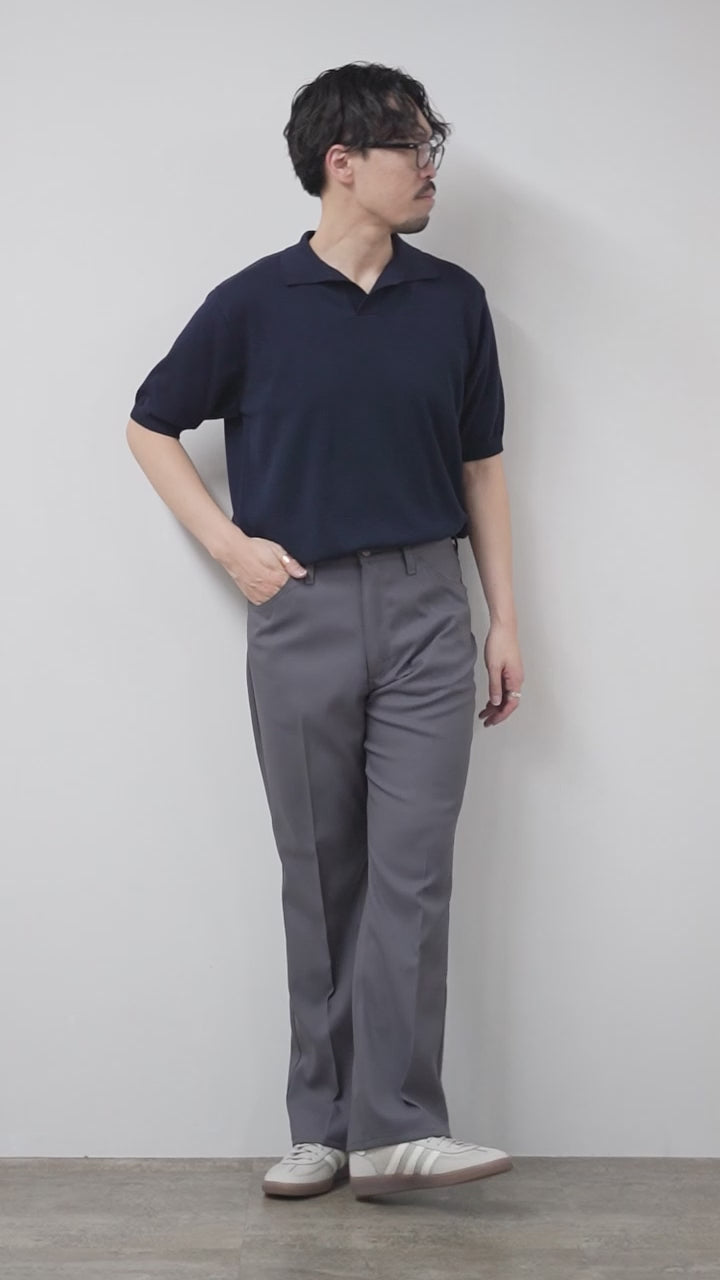 センタープレス入りで、裾に向かって緩やかに広がる独特のフレアシルエットが特徴の一本です。