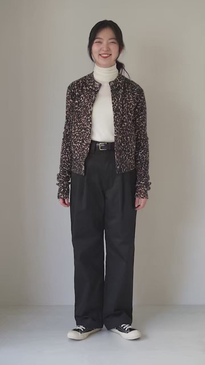 レオパード柄が主役になりながらも、シルエットはコンパクトで品よくまとまる一枚。腰まわりに程よく沿う丈感と、くしゅっとたゆむロングスリーブが上品なバランスを生み、デニムを合わせたカジュアルにも、スカートと合わせたシックな装いにも自然に馴染みます。