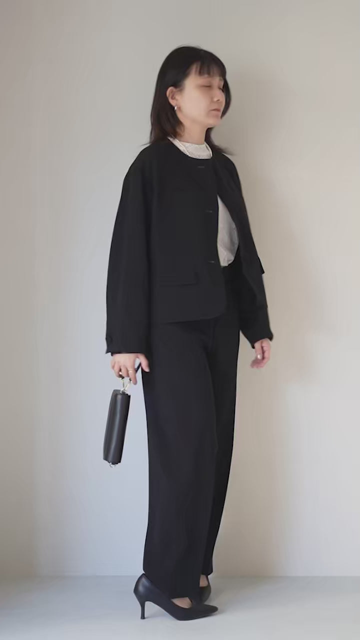 裾はやや長めでヒールだと安心感がありますが、気になる方は裾上げがおすすめです。さらっとした生地感で、季節を問わず着用できそうです。