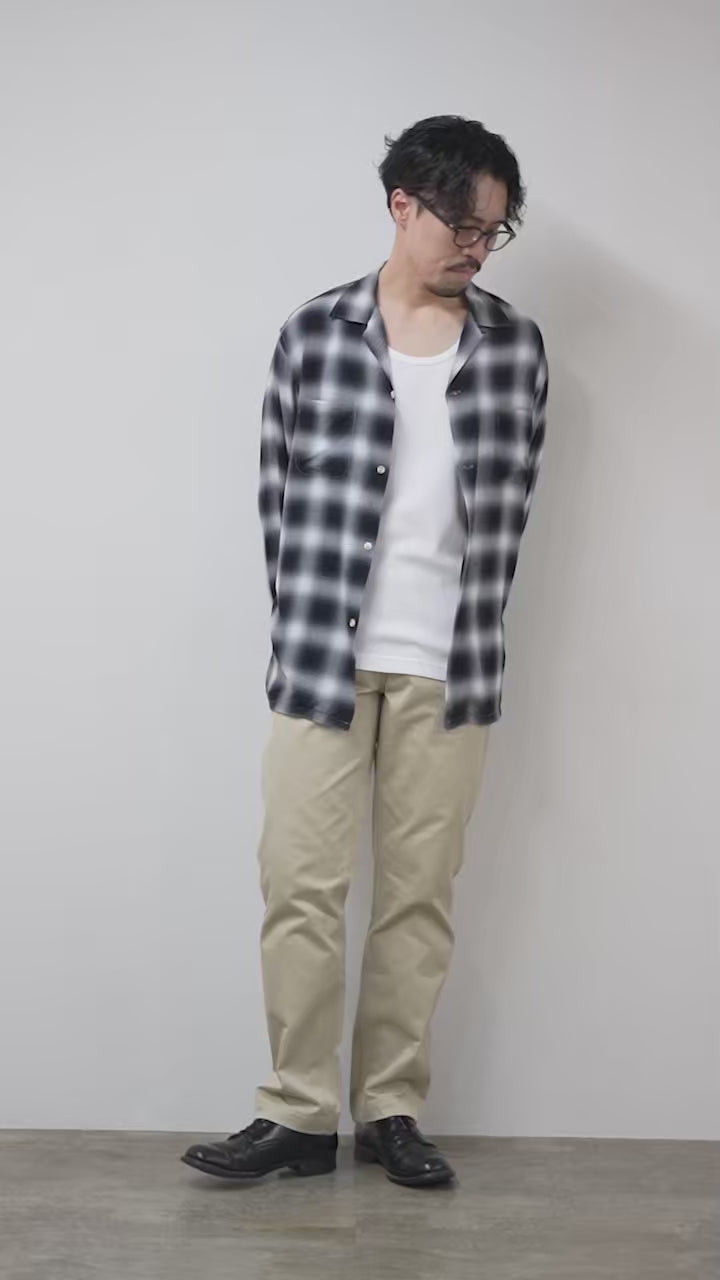 生地は、先染めの産地である新潟県見附市で製織されたレーヨンを使用。ほのかな光沢とドレープ感が、カジュアルな中にも上品な雰囲気を演出。色の境目がやわらかく主張しすぎないオンブレチェックは、柄物でありながら大人の装いに取り入れやすい一着です。