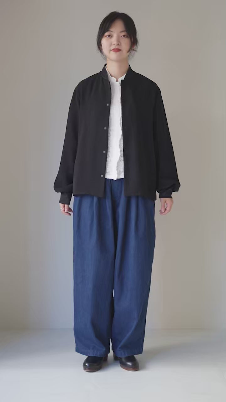 同素材のイージーパンツと合わせると、マニッシュな雰囲気漂うセットアップに。どちらもゆったりとしたサイジングで仕上がったリラクシーなアイテムです。