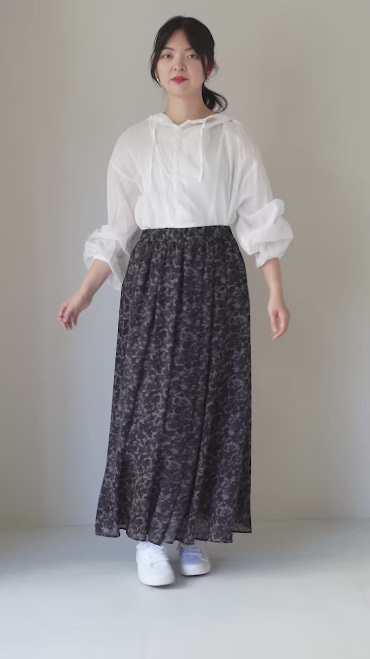 落ち感のある軽やかなジョーゼット生地を使用し、ストンと縦に落ちるフレアシルエットが特徴。歩くたびに柔らかく揺れ、身体にまとわりつかない軽快な穿き心地です。