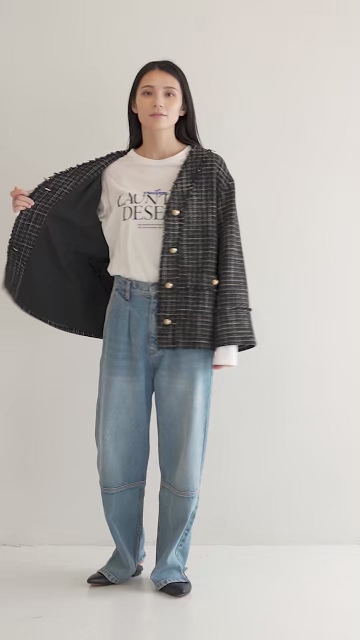 華やかなツイード素材が上品に輝くノーカラージャケット。