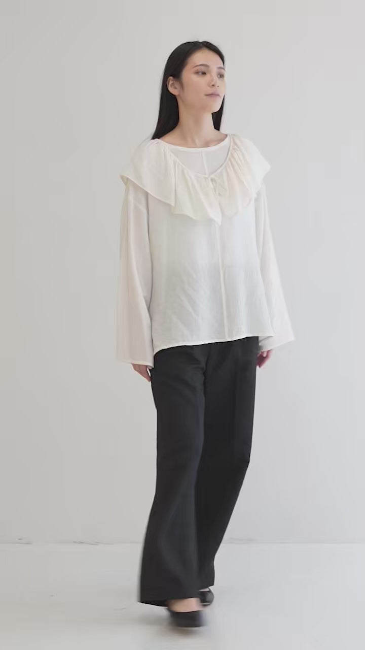 華やかなフリル襟が印象的なブラウス。実はこの襟、ウエストやバストに巻いてアレンジでき、違った表情を楽しめます。