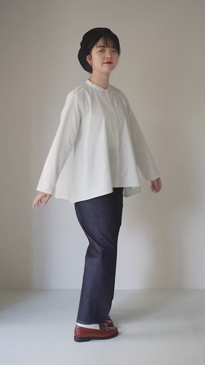 体のラインを拾いすぎないゆったりAラインシルエット。前後差のある裾がフレア感をプラスし、シルエットに動きを加えます。