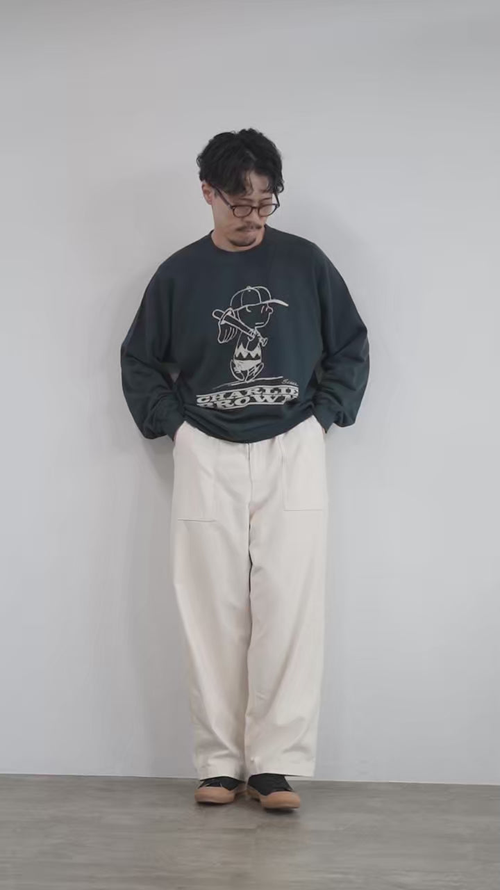 サイズLサイズで適度にゆとりのある“ちょうどいい”フィット感。肩は軽く落ちるくらい、身幅もタイトすぎず、リサイクルコットンらしいナチュラルな風合いが活きるサイズ感でした。着丈は長すぎず、ショーツにもデニムにも合わせやすい長さです。